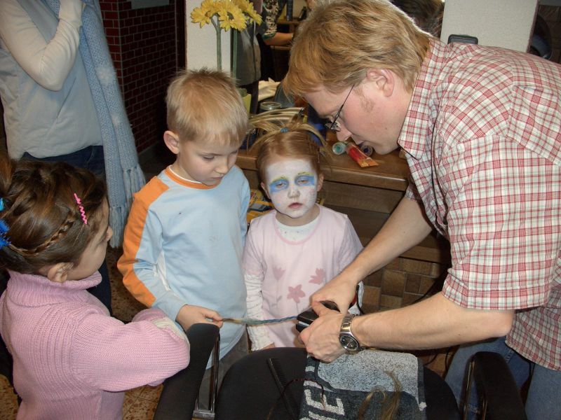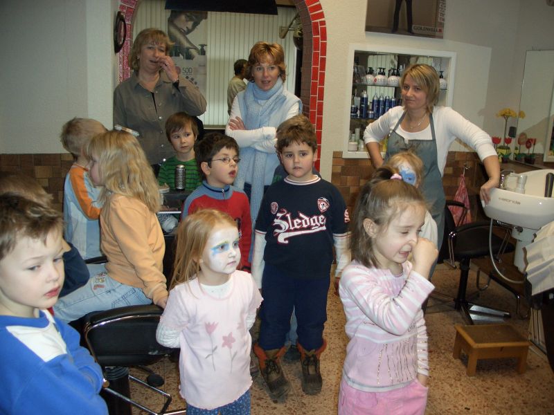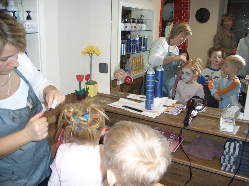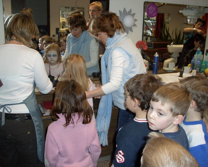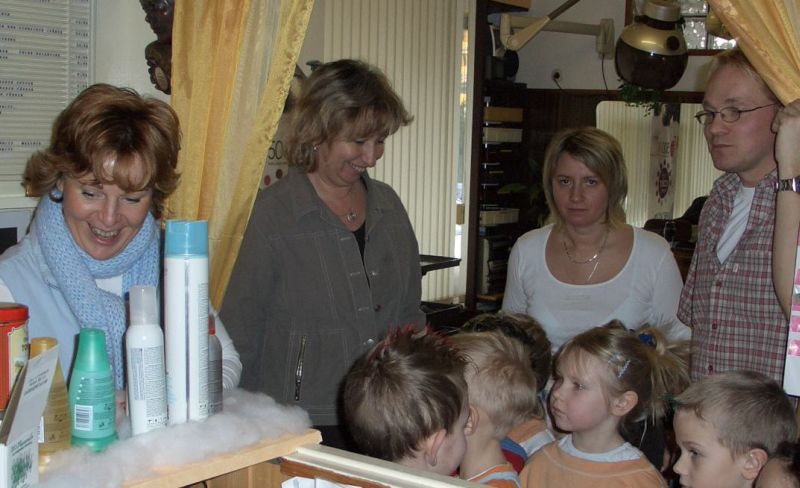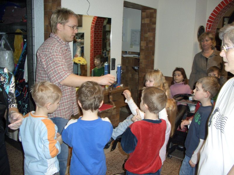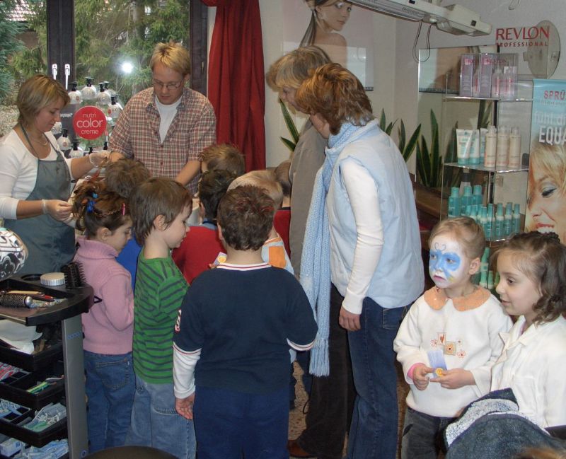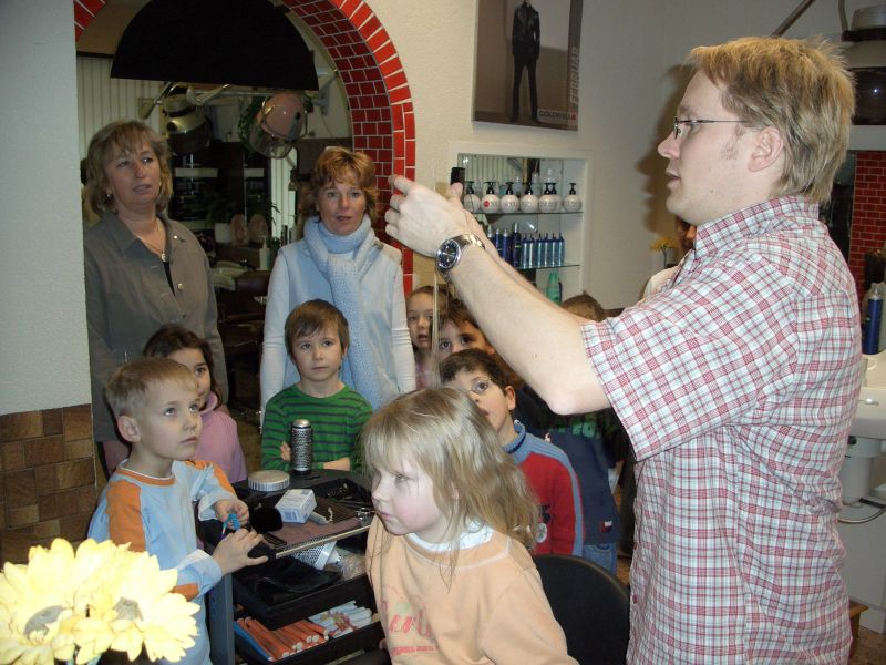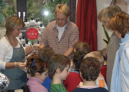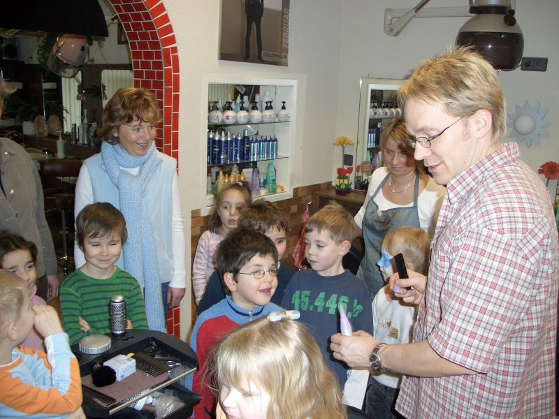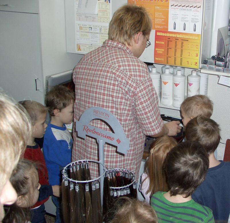 Eines Vormittags war unser Friseursalon gefüllt mit lustigem Kindergeplapper. Die Gruppe von Leo, kam mit Frau Seitz und Frau Arnold um sich einmal so richtig in einem Friseursalon umzusehen. Natürlich musste da etwas geschehen. Darum hat Peter und Conny vieles vorbereitet damit es auch so richtig spannend wurde. Das eine oder andere Köpfchen wurde auch frisiert. Peter zeigte für die Kinder sehr eindrucksvoll was man alles für Haarfarben machen kann und wie Locken gezaubert werden.