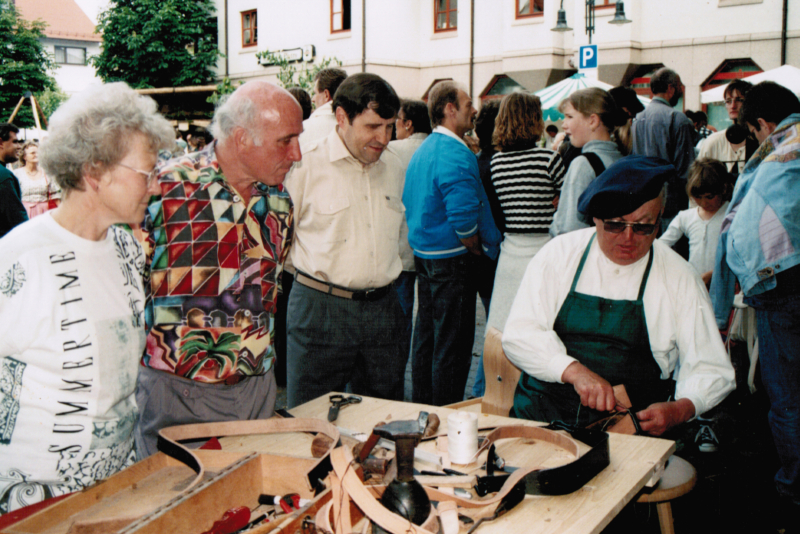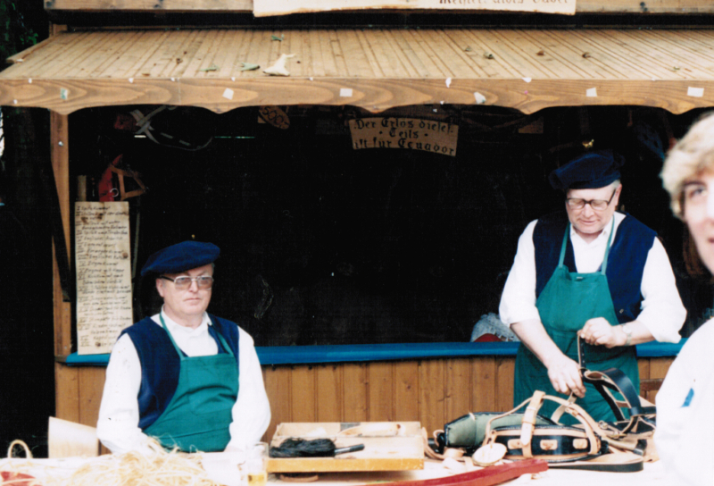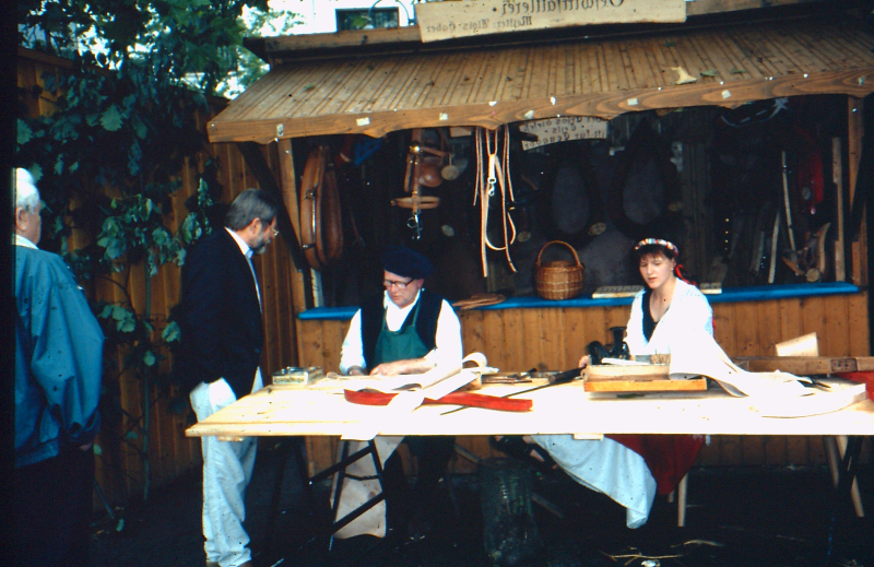 1995 erster Historischer Markt in Fürth. Alois Gaber, Hans Unger und Claudia hatten einen sehr schönen interessanten Stand. Einige mit Hand hergestellte Teile waren zu sehen, auch konnte man beim Erstellen von Lederteilen zusehen. Viele Menschen haben den Beiden über die Schulter geschaut. Alois konnte auch alles sehr gut erklären.